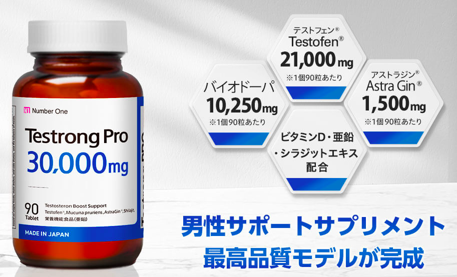 テストロングPRO(90粒/1ヶ月分) テストフェン21,000mgにアストラジン、ビタミンD、亜鉛、シラジットエキスを配合した総合型テストステロン支援サプリ。