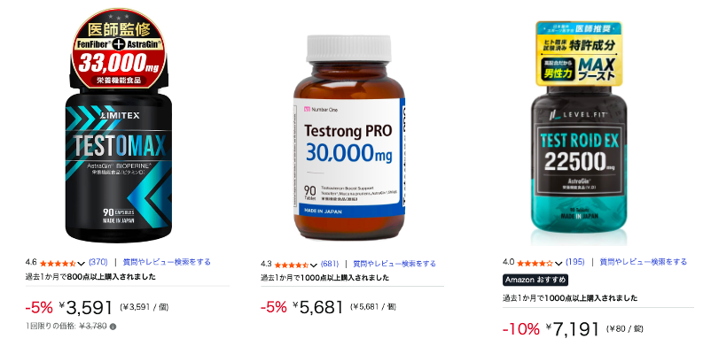 それでは、Amzonで「テストステロンブースター」で検索して表示された売れ筋ランキングベスト3のサプリを見ていきましょう!